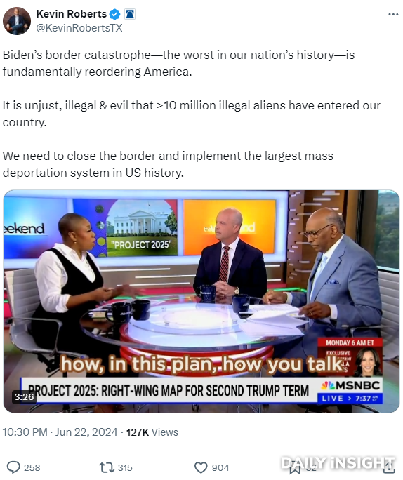 미국 보수의 대표적인 싱크탱크인 헤리티지 재단의 회장 케빈 로버츠(Kevin Roberts)는 지난 토요일 아침 MSNBC에서 이민자 문제로 전 미 부통령 수석 대변인 겸 선임 고문인 시모네 샌더스 타운센드(Symone Sanders-Townsend)와 전 메릴랜드 부지사인 마이클 스틸(Michael Steele)과 강하게 충돌했다.